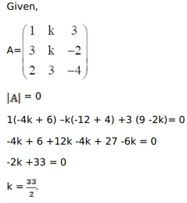 If $A=\left(\begin{array}{ccc}1 & k & 3 \\ 3 & k & -2 \\ 2 & 3 & -4\end{array}\right)$ is singular then $k=?$