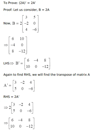 If $\mathrm{A}=\left[\begin{array}{cc}3 & 5 \\ -2 & 0 \\ 4 & -6\end{array}\right]$, verify that $(2 \mathrm{~A})^{\prime}=2 \mathrm{~A}^{\prime}$