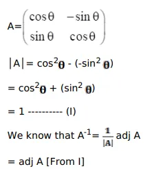 If $A=\left(\begin{array}{cc}\cos \theta & -\sin \theta \\ \sin \theta & \cos \theta\end{array}\right)$ then $A^{-1}=?$