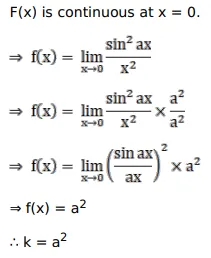 If the function $f(x)=\left\{\begin{array}{c}\frac{\sin ^{2} a x}{x^{2}}, \text { when } x \neq 0 \\ k, \text { when } x=0\end{array}\right.$ is continuous at $x=0$ then $k=?$