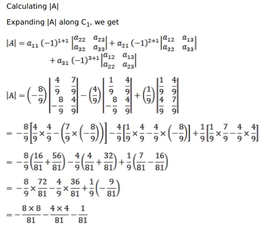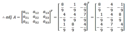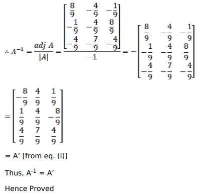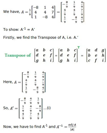 If $A=\frac{1}{9}\left[\begin{array}{ccc}-8 & 1 & 4 \\ 4 & 4 & 7 \\ 1 & -8 & 4\end{array}\right]$ show that $A^{-1}=A^{\prime}$.