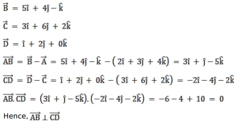 If $A(2,3,4), B(5,4,-1), C(3,6,2)$ and $D(1,2,0)$ be four points, show that $\overrightarrow{A B}$ is perpendicular to $\overrightarrow{C D}$.