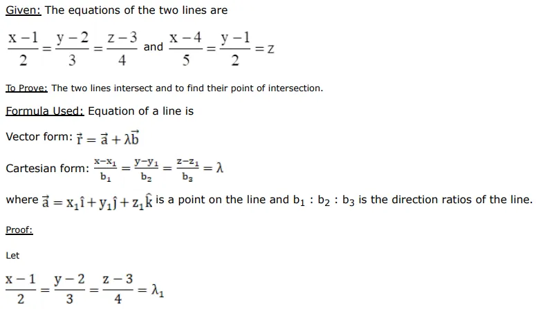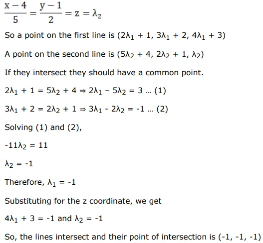 Show that the lines $\frac{\mathrm{x}-1}{2}=\frac{\mathrm{y}-2}{3}=\frac{\mathrm{z}-3}{4}$ and $\frac{\mathrm{x}-4}{5}=\frac{\mathrm{y}-1}{2}=\mathrm{z}$ intersect each other. Also, find the point of their intersection.