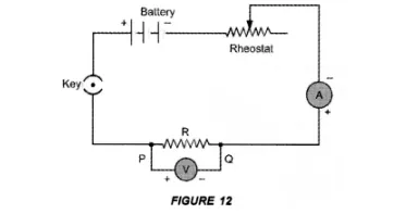 Apparatus : A conductor of resistance R, an ammeter, a voltmeter, a battery, a variable resistance (or rheostat used to change the current in the circuit), connecting wires, a key and sand paper.