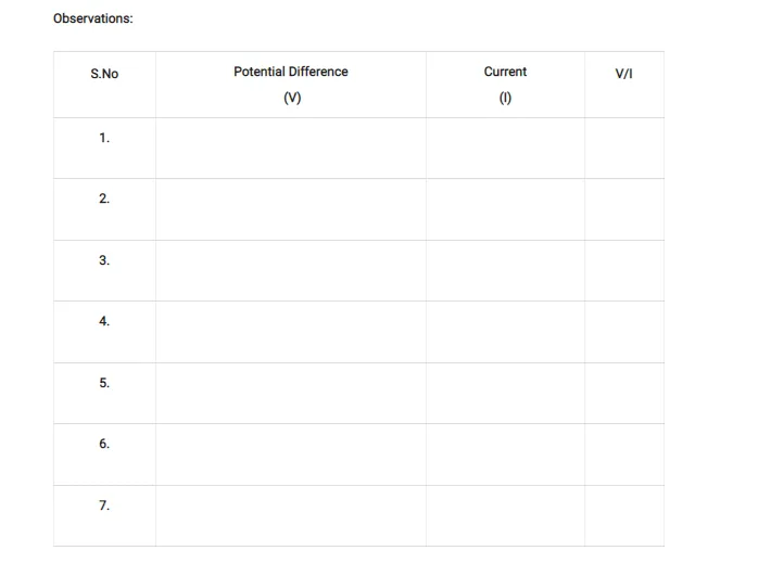 Conclusion: From the graph between V and I, we conclude that I x V, which is Ohm’s law. Hence Ohm’s law is verified experimentally.