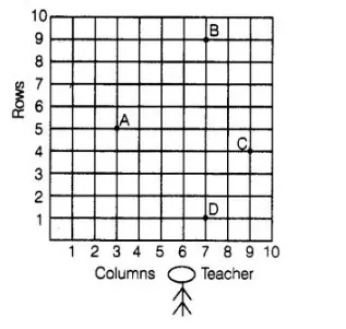 Students of a school are standing in rows and columns in their playground for a drill practice. A, B, C and D are the positions of four students as shown