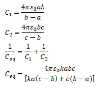 Suppose the space between the two inner shells of the previous problem is filled with a dielectric of dielectric constant K. Find the capacitance of the system between $A$ and $B$.