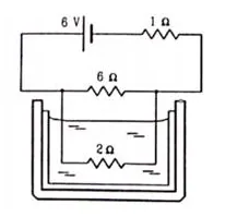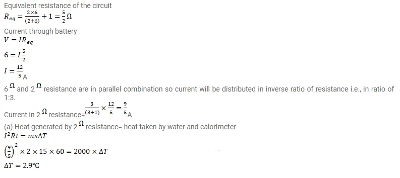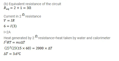 The $2.0 \Omega$ resistor shown in figure is dipped into a calorimeter containing water. The heat capacity of the calorimeter together with water is $2000 \mathrm{~J} / \mathrm{K}$. (a) If the circuit is active for 15 minutes, what would be the rise in the temperature of the water? (b) Suppose the $6.0 \Omega$ resistor gets burnt. What would be the rise in the temperature of the water in the next 15 minutes?