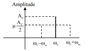 The amplitude of upper and lower side bands of A.M. wave where a carrier signal with frequency $11.21 \mathrm{MHz}$, peak voltage $15 \mathrm{~V}$ is amplitude modulated by a $7.7 \mathrm{kHz}$ sine wave of $5 \mathrm{~V}$ amplitude