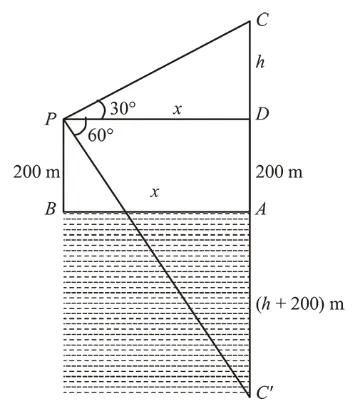 The angle of elevation of a cloud $C$ from a point $P, 200 \mathrm{~m}$ above a still lake is $30^{\circ}$. If the angle of depression of the image of $C$ in the lake from the point $P$ is $60^{\circ}$, then $P C$ (in $\mathrm{m}$ ) is equal to: