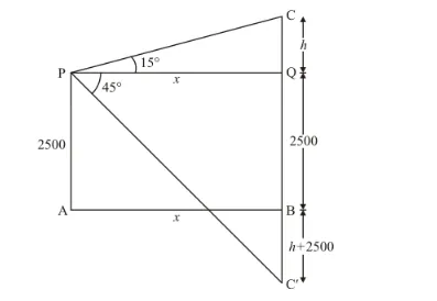 Let $\mathrm{PQ}=x \mathrm{~m}, \mathrm{CQ}=h, \mathrm{QB}=2500 \mathrm{~m}$. then $\mathrm{CB}=h+2500$ consequently $\mathrm{C}^{\prime} \mathrm{B}=h+2500 \mathrm{~m} .$ and $\angle \mathrm{CPQ}=15^{\circ}, \angle Q P C^{\prime}=45^{\circ}$.