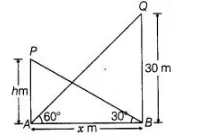 Given that, height of the tower = QB = 30 m and ∠QAB = 60°, ∠PBA = 30°
