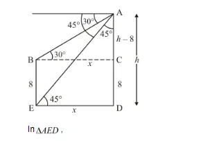 Let AD be the multistoried building of height h m. And angle of depression of the top and bottom are 30° and 45°. We assume that BE = 8, CD = 8 and BC = x, ED = x and