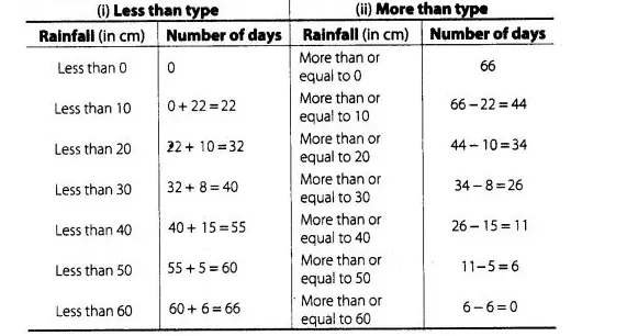 So, the total annual rainfall record of a city for less than 10 cm is 0+ 22 =22 days. Continuing in this manner, we will get remaining less than 20,
