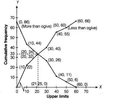 Firstly, we plot a line parallel to X-axis at intersection point of both ogives, which further intersect at (0, 33) on Y-axis. Now, we draw a line