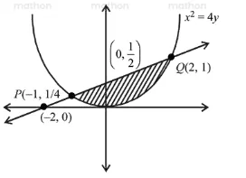 Area $=\int_{-1}^{2}\left[\left(\frac{x+2}{4}\right)-\left(\frac{x^{2}}{4}\right)\right] d x=\left[\frac{x^{2}}{8}+\frac{1}{2} x-\frac{x^{3}}{12}\right]_{-1}^{2}$