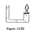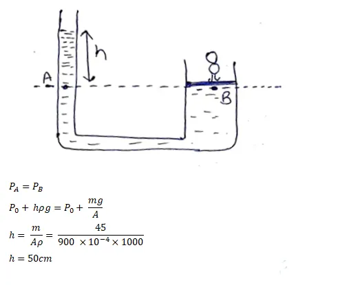 The area of cross-section of the wider tube shown in figure (13-E2) is $900 \mathrm{~cm}^{2}$. If the boy standing on the piston weighs $45 \mathrm{~kg}$, find the difference in the levels of water in the two tubes.