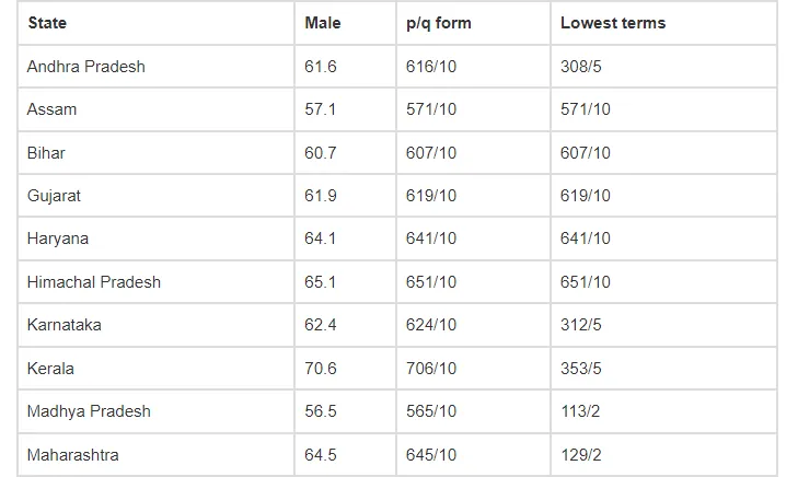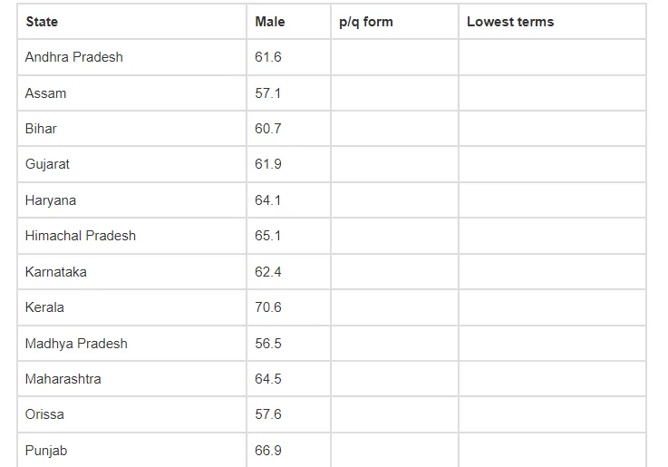The average life expectancies of males for several states are shown in the table. Express each decimal in the form p/q and arrange the states from the least to the greatest male life expectancy. State-wise data are included below; more indicators can be found in the “FACTFILE” section on the homepage for each state.