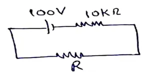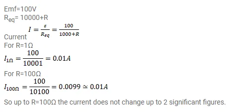 The battery of emf $100 \mathrm{~V}$ and a resistor of resistances $10 \mathrm{k} \Omega$ are joined in series. This system is used as a source to supply current to an external resistance $\mathrm{R}$. If $\mathrm{R}$ is not greater than $100 \Omega$, the current through it is constant up to two significant digits. Find its value. This is the basic principle of a constant-current source