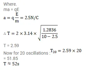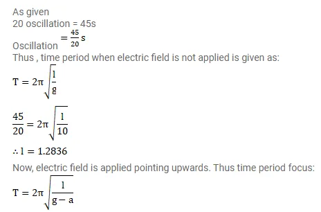 The bob of a simple pendulum has a mass of $40 \mathrm{~g}$ and a positive charge of $4.0 \times 10^{-6} \mathrm{C}$. It makes 20 oscillations in $45 \mathrm{~s}$. A vertical electric field pointing upward and of magnitude $2.5^{\times 10^{4}} \mathrm{~N} / \mathrm{C}$ is switched on. How much time will it now take to complete 20 oscillations?