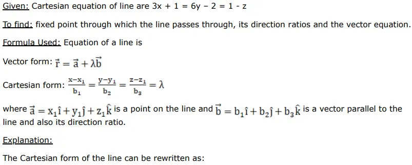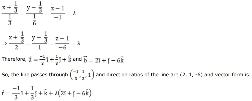 The Cartesian equations of a line are $3 x+1=6 y-2=1-z$. Find the fixed point through which it passes, its direction ratios and also its vector equation.