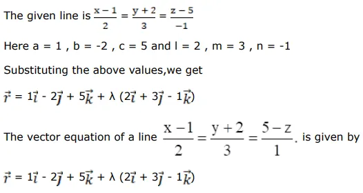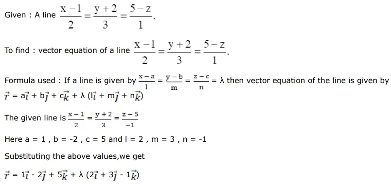 The Cartesian equations of a line are $\frac{x-1}{2}=\frac{y+2}{3}=\frac{5-z}{1}$. Find its vector equation.