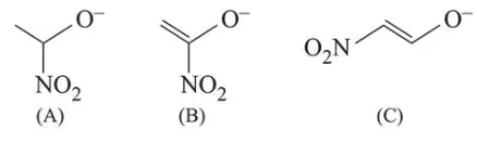 Electron withdrawing group like $\left(\mathrm{NO}_{2}\right)$ increase stability of alkoxide ion by dispersal of negative charge. In (B) and (C) structures negative charge is in conjugation with double bond and also stabilised by electron withdrawing effect of nitro group.