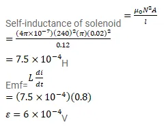 The current in a solenoid of 240 turns, having a length of $12 \mathrm{~cm}$ and a radius of $2 \mathrm{~cm}$, changes at a rate of $0.8 \mathrm{~A} / \mathrm{s}$. Find the emf induced in it.