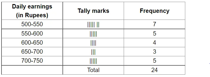 Prepare a frequency table taking equal class sizes. One such class is 500−550, where 550 is not included.