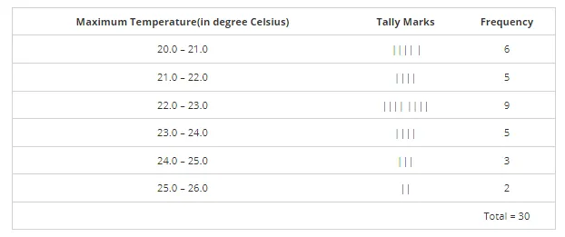 Represent the data in the form of a frequency distribution table with class size 11°C.