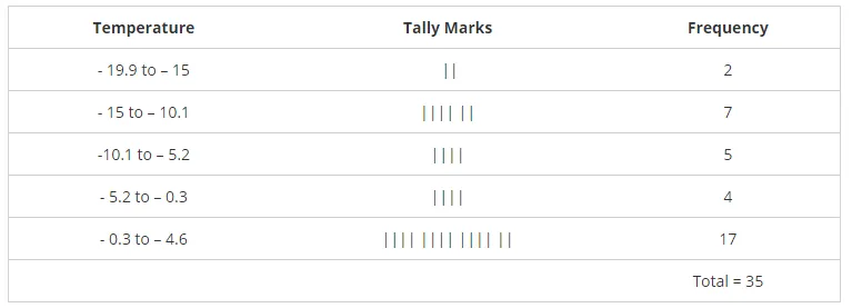 Represent them as frequency distribution table taking -19.9 to -15 as the first class interval.