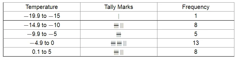 Represent them as frequency distribution table taking − 19.9 to − 15 as the first class interval.