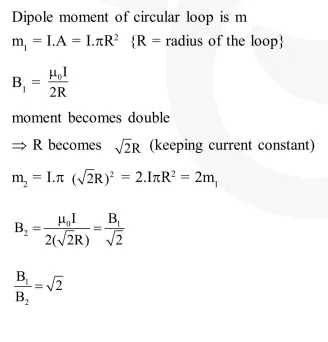 The dipole moment of a circular loop carrying a current $\mathrm{I}$, is $\mathrm{m}$ and the magnetic field at the centre of the loop is $\mathrm{B}_{1}$. When the dipole moment is doubled by keeping the current constant, the magnetic field at the centre of the loop is $B_{2}$. The ratio $\frac{B_{1}}{B_{2}}$ is :
