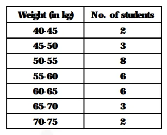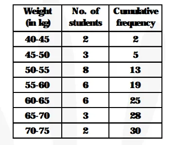 The distribution below gives the weights of 30 students of a class. Find the median weight of the students.