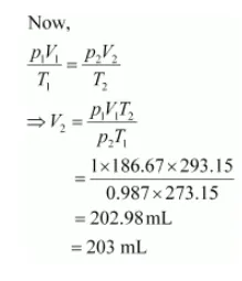 at p2 = 0.987 atm (since 1 bar = 0.987 atm) and T2 = 20°C = (273.15 + 20) K = 293.15 K..