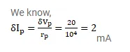 The dynamic plate resistance of a triode value is $10 \mathrm{k}^{\Omega}$. Find the change in the plate current if the plate voltage is changed from $200 \mathrm{~V}$ to $220 \mathrm{~V}$.