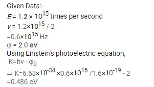The electric field associated with a monochromatic beam is $1.2 \times 10^{15}$ times per second. Find the maximum kinetic energy of the photoelectrons when this light falls on a metal surface whose work function is $2.0 \mathrm{eV}$.