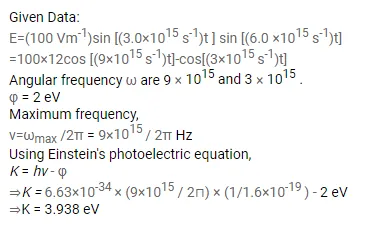The electric field at a point associated with a light wave isE $=\left(100 \mathrm{Vm}^{-1}\right) \sin \left[\left(3.0 \times 10^{15} \mathrm{~s}^{-1}\right) \mathrm{t}\right] \sin \left[\left(6.0 \times 10^{15} \mathrm{~s}^{-1}\right) \mathrm{t}\right]$. If this light falls on a metal surface with a work function of $2.0 \mathrm{eV}$, what will be the maximum kinetic energy of the photoelectrons?