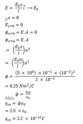Find the charge contained inside a cubical volume bounded by the surfaces $x=0, x=a, y=a, z=0$ and $z=a$. Take $E_{0}=5 \times 10^{3} \mathrm{~N} / \mathrm{c}, l=2 \mathrm{~cm}$ and $a=1 \mathrm{~cm}$