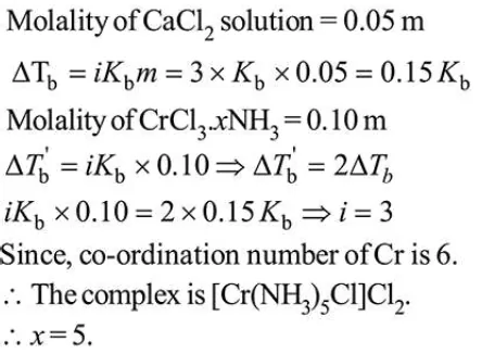 The elevation of boiling point of $0.10 \mathrm{~m}$ aqueous $\mathrm{CrCl}_{3} \cdot x \mathrm{NH}_{3}$ solution is two times that of $0.05 \mathrm{~m}$ aqueous $\mathrm{CaCl}_{2}$ solution. The value of $x$ is____________________