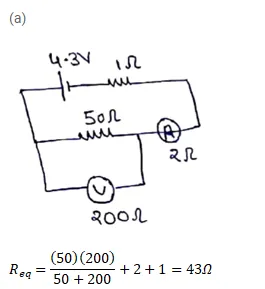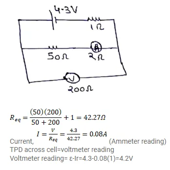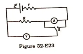 The emf $\varepsilon$ and the internal resistance r of the battery shown in figure (32-E23) are $4.3 \mathrm{~V}$ and $1.0 \Omega$ respectively. The external resistance $R$ is $50 \Omega$. The resistances of the ammeter and voltmeter are $2.0 \Omega$ and $200 \Omega$ respectively.