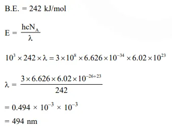 The energy required to break one mole of $\mathrm{Cl}-\mathrm{Cl}$ bonds in $\mathrm{Cl}_{2}$ is $242 \mathrm{~kJ} \mathrm{~mol}^{-1}$. The longest wavelength of light capable of breaking a single $\mathrm{Cl}-\mathrm{Cl}$ bond is