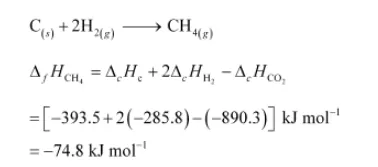 $\therefore$ Enthalpy of formation of $\mathrm{CH}_{4(g)}=-74.8 \mathrm{~kJ} \mathrm{~mol}^{-1}$