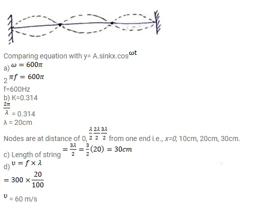 The equation for the vibration of a string, fixed at both ends vibrating in its third harmonic is given by $\mathrm{y}=(0.4 \mathrm{~cm}) \sin \left[\left(0.314 \mathrm{~cm}^{-1}\right) \mathrm{x}\right] \cos \left[\left(600 \pi \mathrm{s}^{-1}\right) \mathrm{t}\right]$