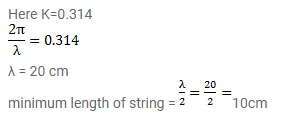 The equation of a standing wave, produced on a string fixed at both ends, is $\left.\mathrm{y}=(0.4 \mathrm{~cm}) \sin \left[\left(0.314 \mathrm{~cm}^{-1}\right) \mathrm{x}\right] \cos \left[600^{\pi \mathrm{s}^{-1}}\right) \mathrm{t}\right]$ What could be the smallest length of the string?