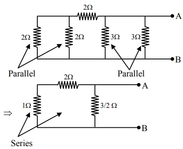 $R_{e q}=\frac{3 \times 3 / 2}{3+3 / 2}=\frac{9 / 2}{9 / 2}=1 \Omega$