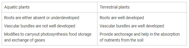 The essential functions of roots are anchorage and absorption of water and minerals in the terrestrial plant. What functions are associated with the roots of aquatic plants? How are the roots of aquatic plants and terrestrial plants different?