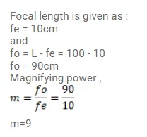 The eyepiece of an astronomical telescope has a focal length of $10 \mathrm{~cm}$. The telescope is focused for normal vision of distant objects when the tube length is $1.0 \mathrm{~m}$.