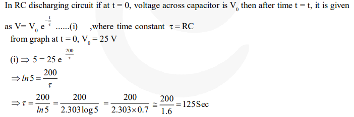 Question: The figure shows an experimental plot for discharging of a capacitor in an $\mathrm{R}-\mathrm{C}$ circuit. The time constant $\tau$ of this circuit lies between:-
