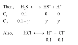 In the presence of $0.1 \mathrm{M}$ of $\mathrm{HCl}$, let $\left[\mathrm{HS}^{-}\right]$be $y \mathrm{M}$.